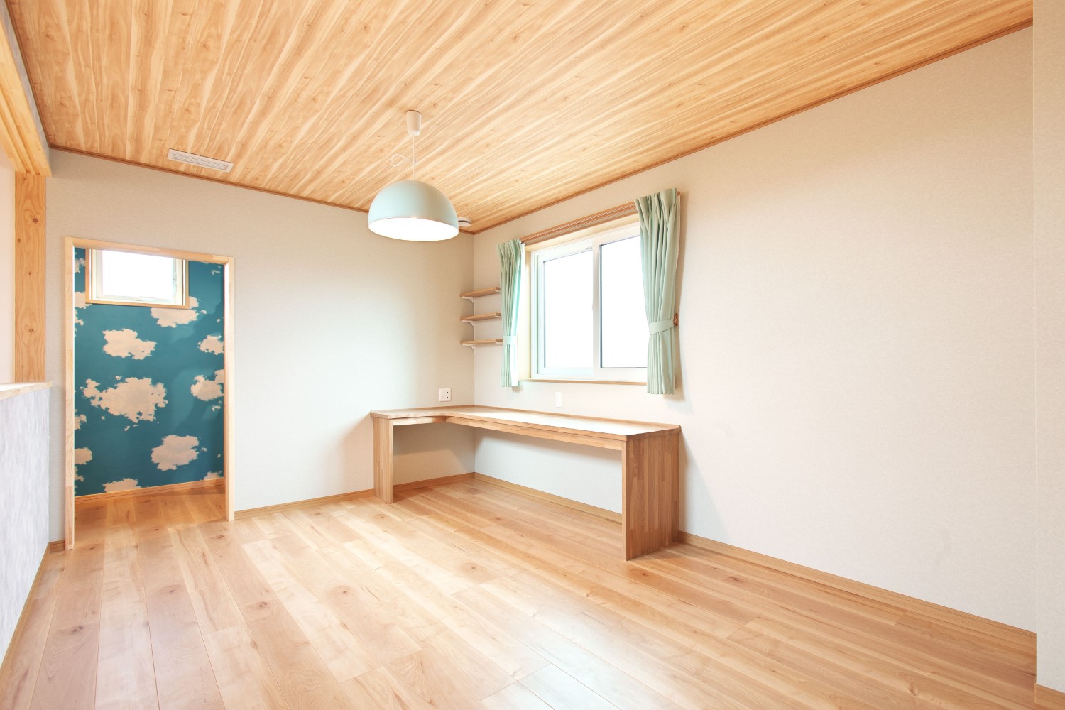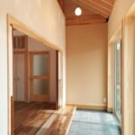 室内のインナーテラスの先には屋根のあるウッドデッキが繋がり、楽しいガーデニングや畑作業など日々の生活にぴったりなレイアウトです。リビングは漆喰塗りの白い壁に真壁(柱を隠さない)の造りにする事で、木のぬくもりが随所に感じられます。規則正しく並んだ梁やタルキの現し構造が見える吹抜けから、2階のホールにつながる空間はより開放的で構造体の力強さが伝わります。